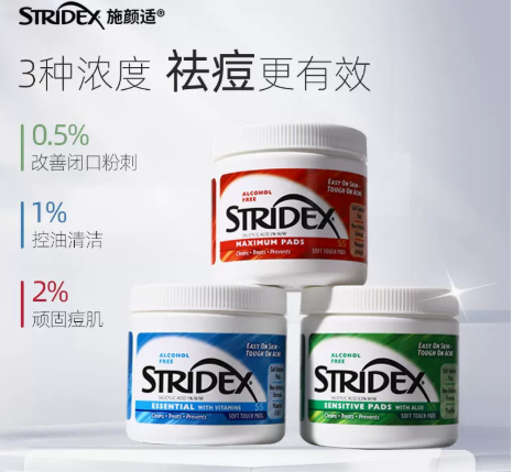 stridex水杨酸棉片远销欧美、韩国等国家,其产品根据不同的肤质有...